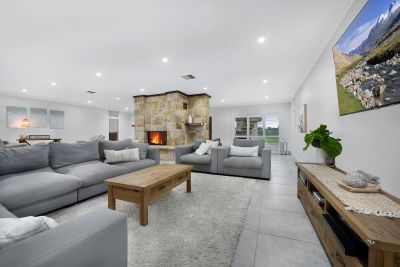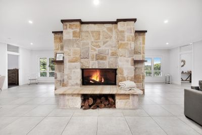 - Striking sandstone feature wall with a large combustion fireplace