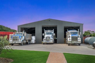 - Main shed measuring 23 x 17 x 5m with 2 drive-through bays for semi-trailers, 5 roller doors, compressed air lines, 240-volt power points, 3-phase power, and a car hoist